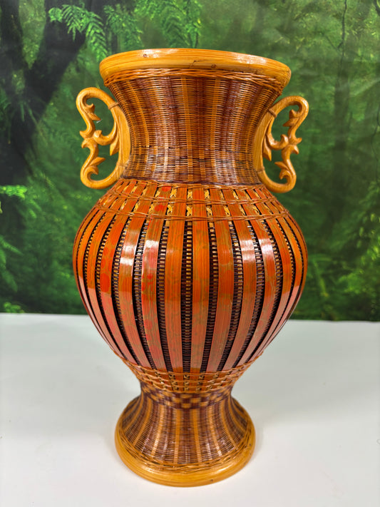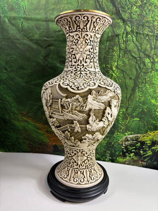 A Fabulous Chinese Cinnabar Intricate Asian Relief 15 Inch Vase W/Wood Stand/Base