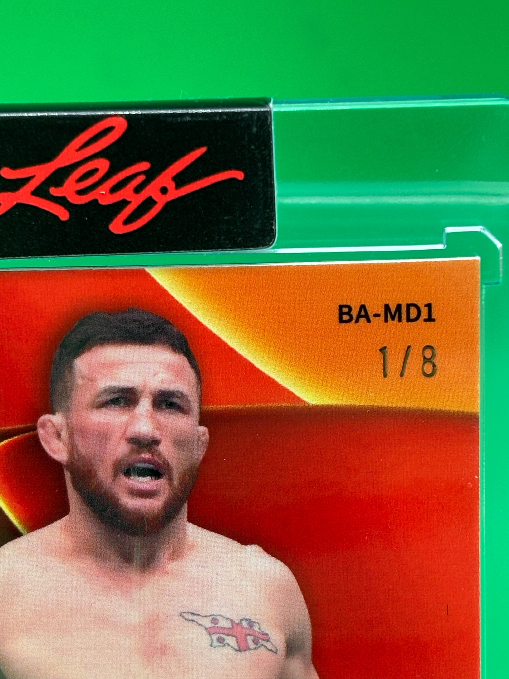 Scarce 2026 Leaf Sports Heroes Merab Dvalishvili auto /8, card BA-MD1, factory encased by Leaf. Clean-looking low-numbered autograph of one of the top names in UFC’s bantamweight division. Excellent piece for MMA and Leaf auto collectors.