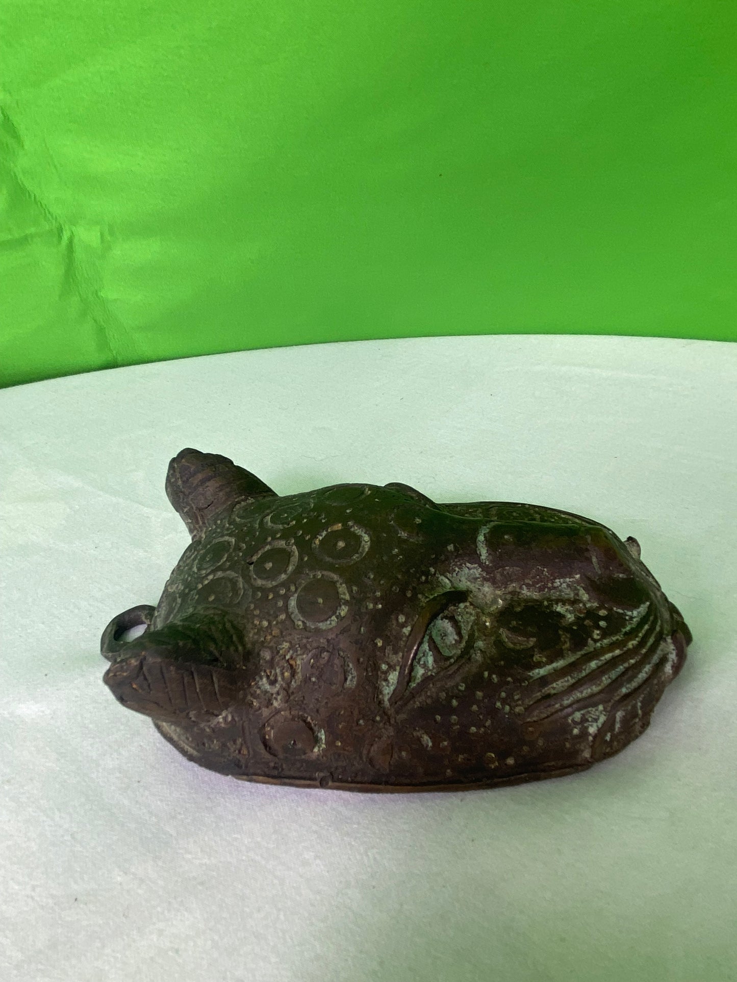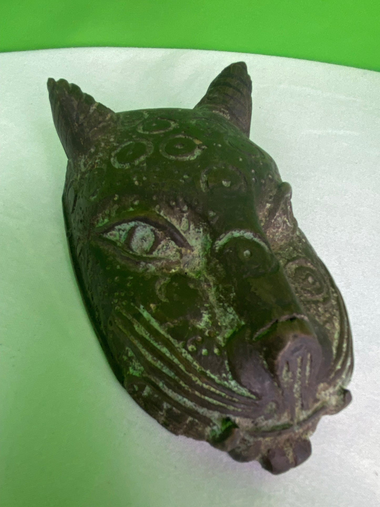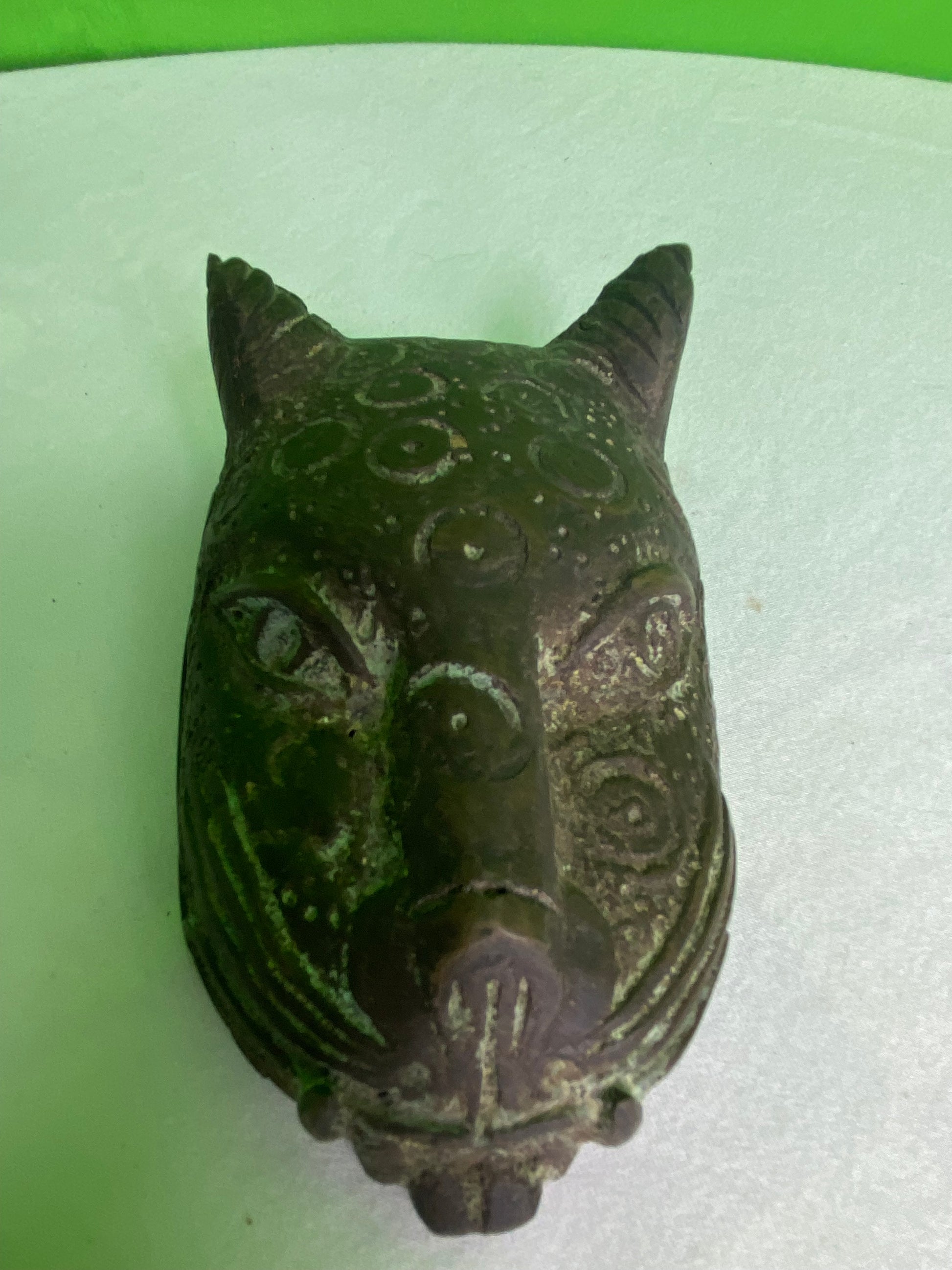 Own a powerful piece of African artistry with this Benin bronze leopard head, a striking symbol of strength and royalty, exquisitely crafted with intricate detail and cultural significance.