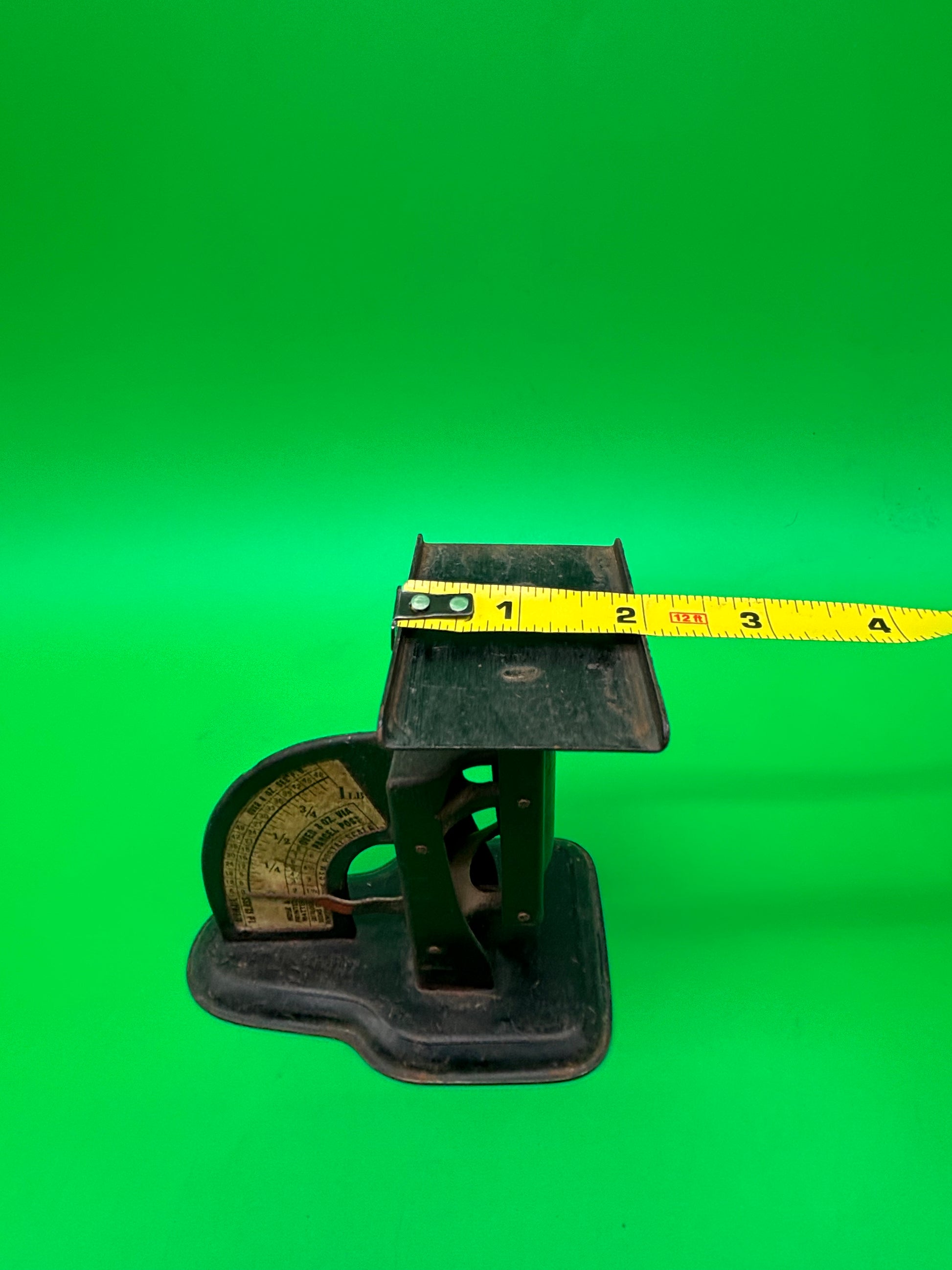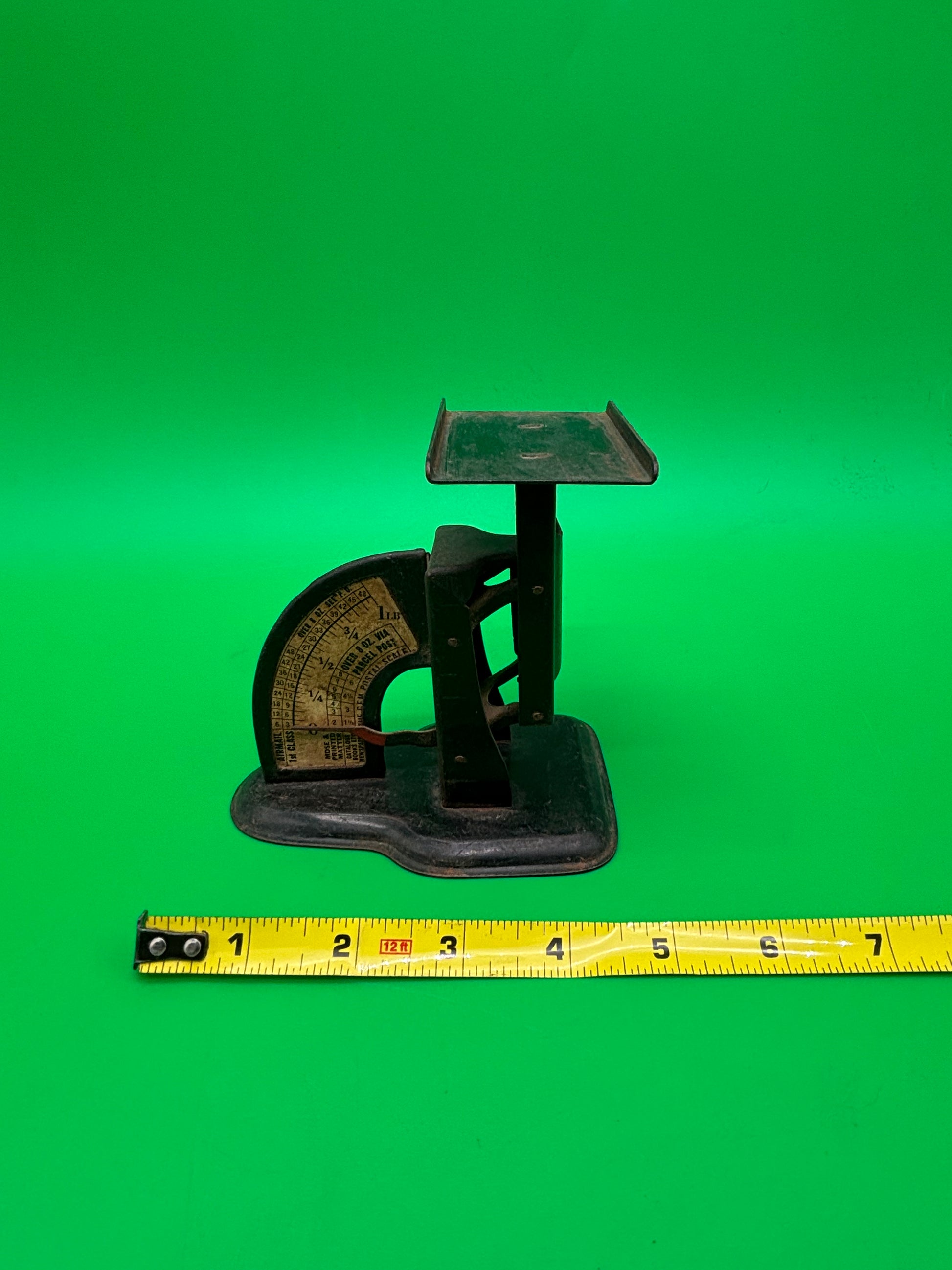 This scale features a compact cast metal base with an elevated platform and the iconic curved rate chart showing ounce markings and postal classes. A really cool functional display piece for anyone who loves antique office tools.