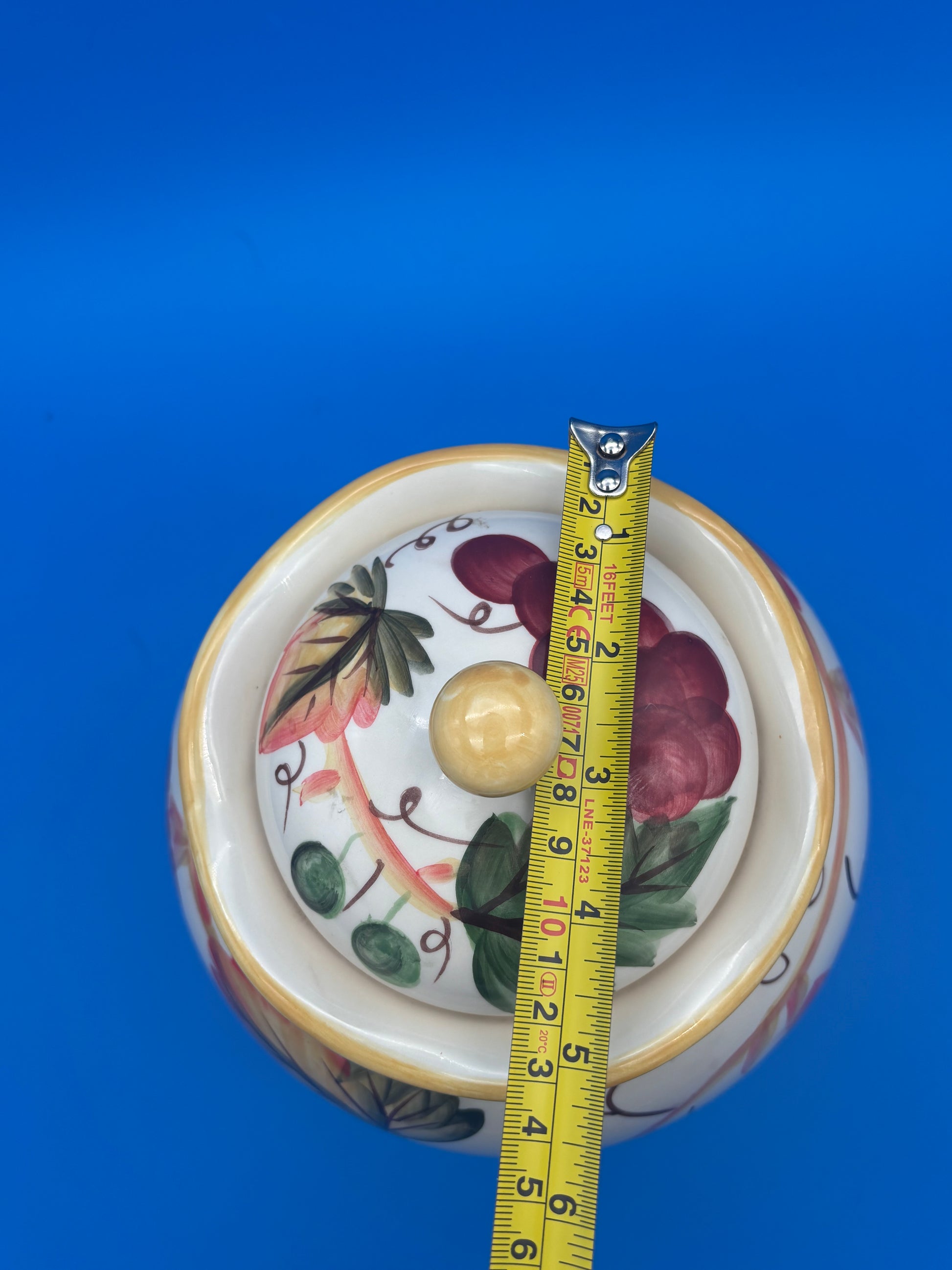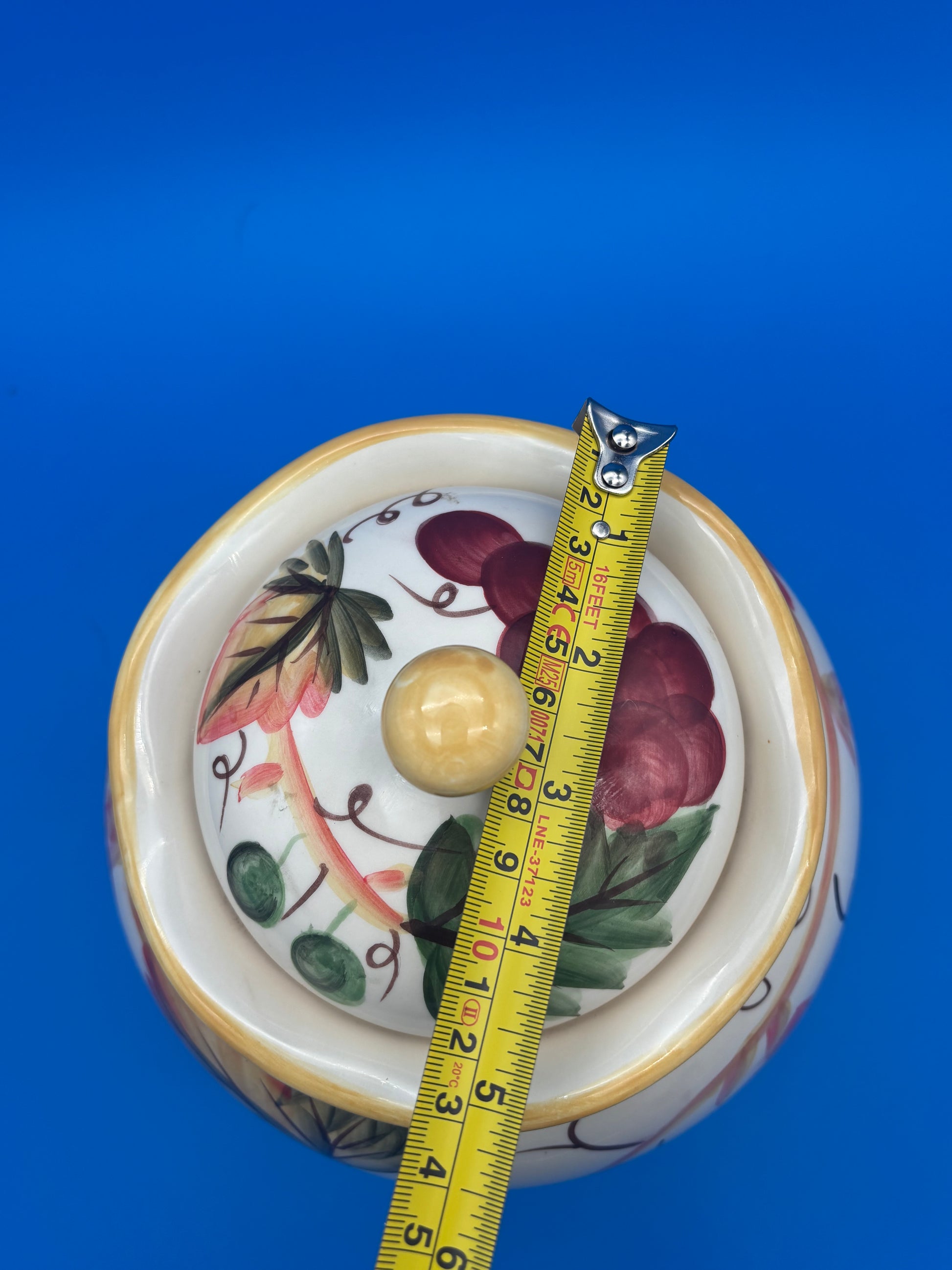 This jar is both decorative and functional, perfect for storing cookies, biscotti, treats, or kitchen essentials. The grape motif makes it an ideal accent for traditional, farmhouse, or wine-inspired kitchens.
