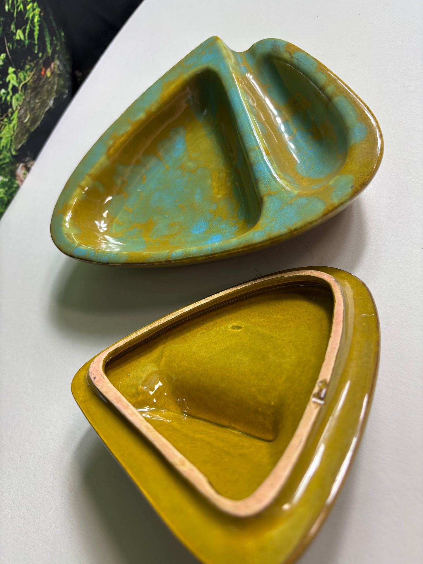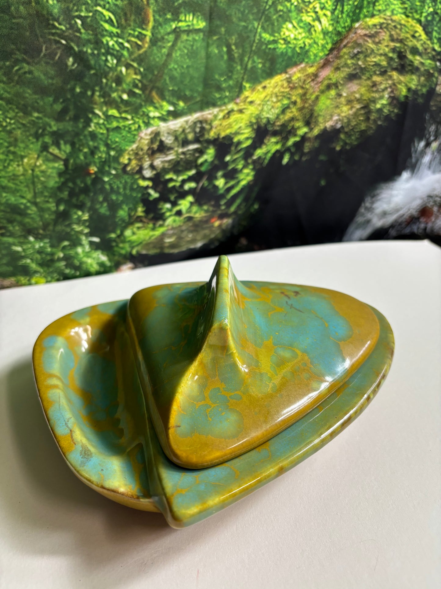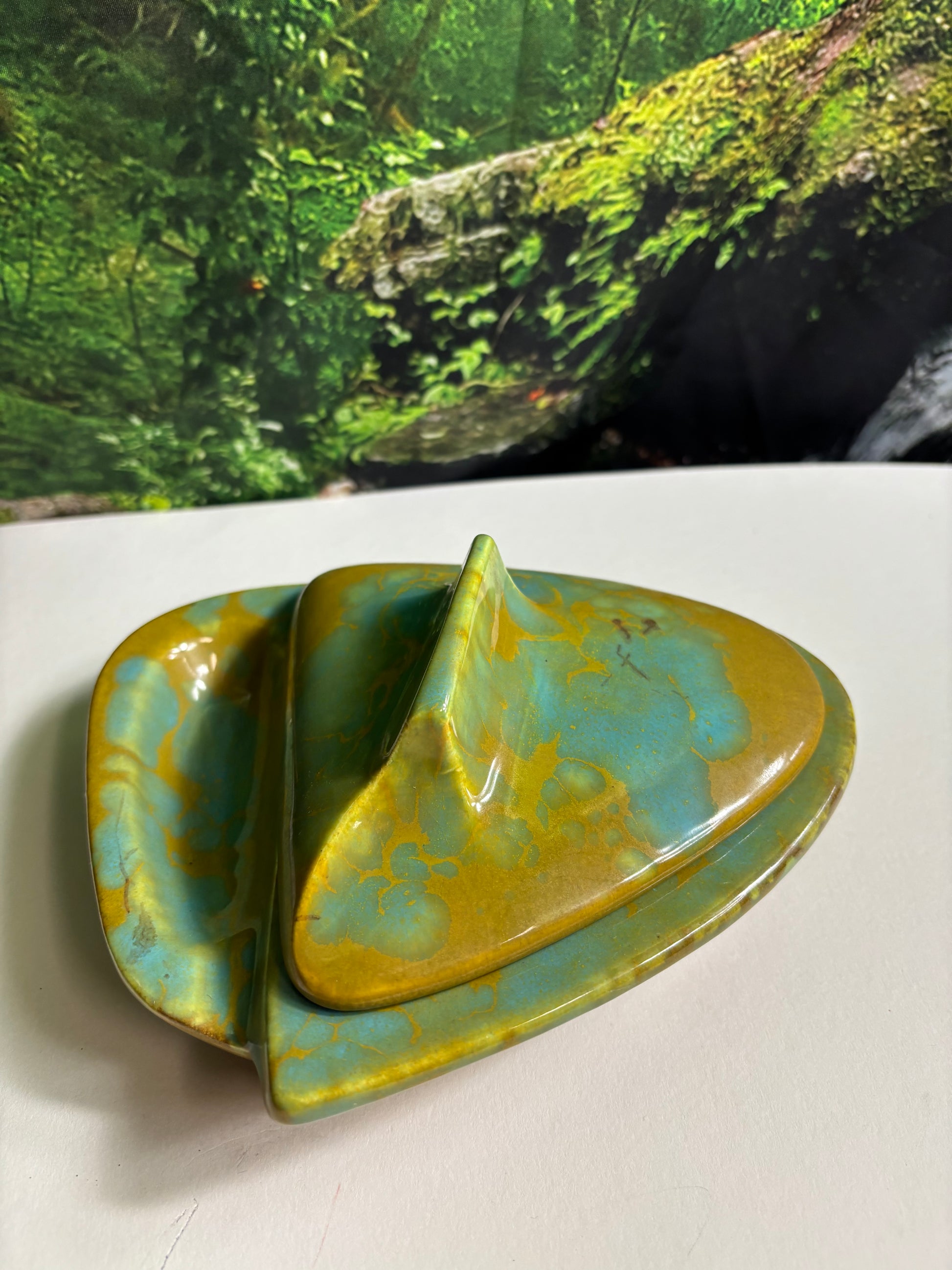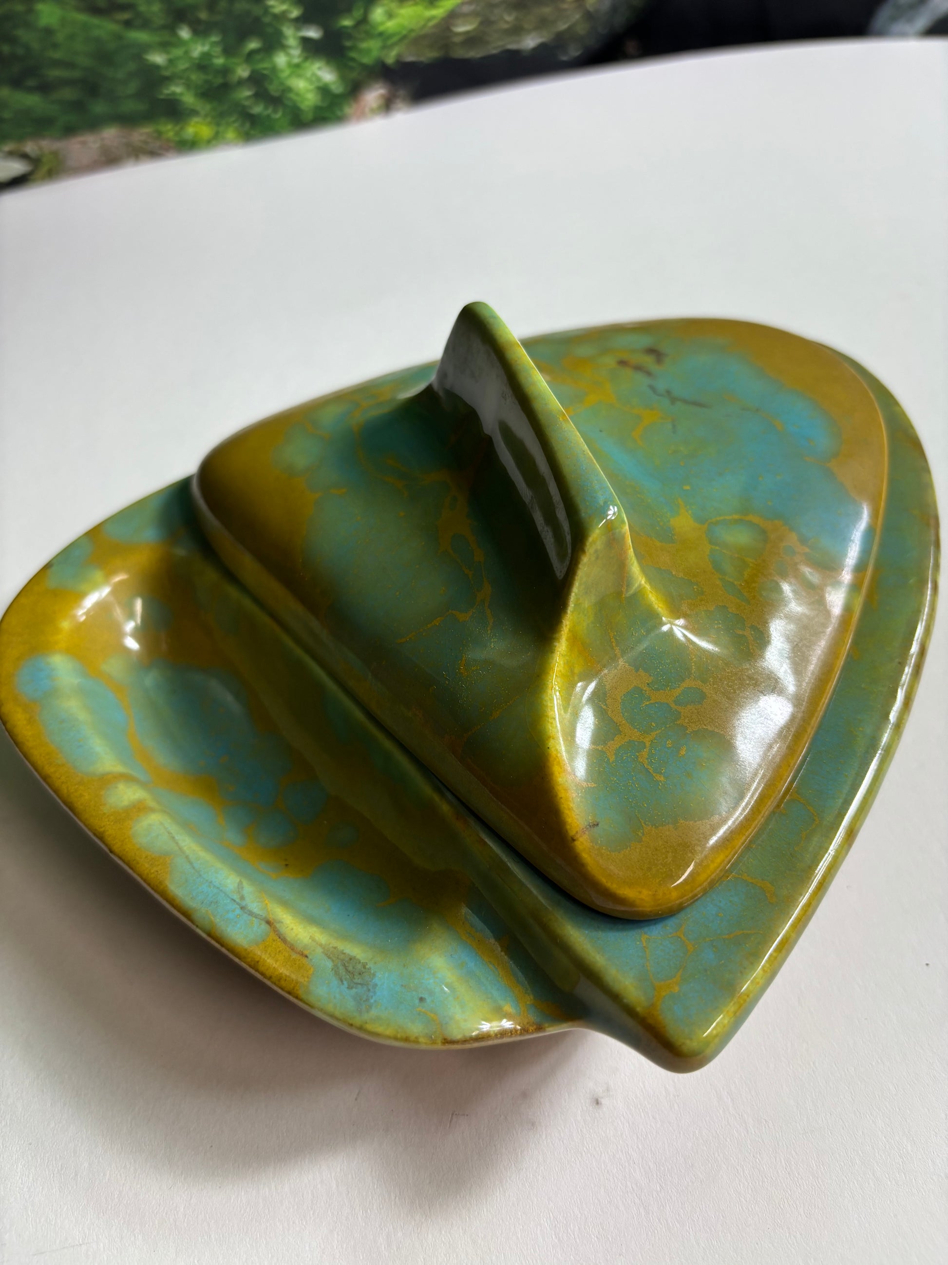 Fabulous Enchanto Pottery California Mid-century Vintage Avocado Green & Teal Ashtray