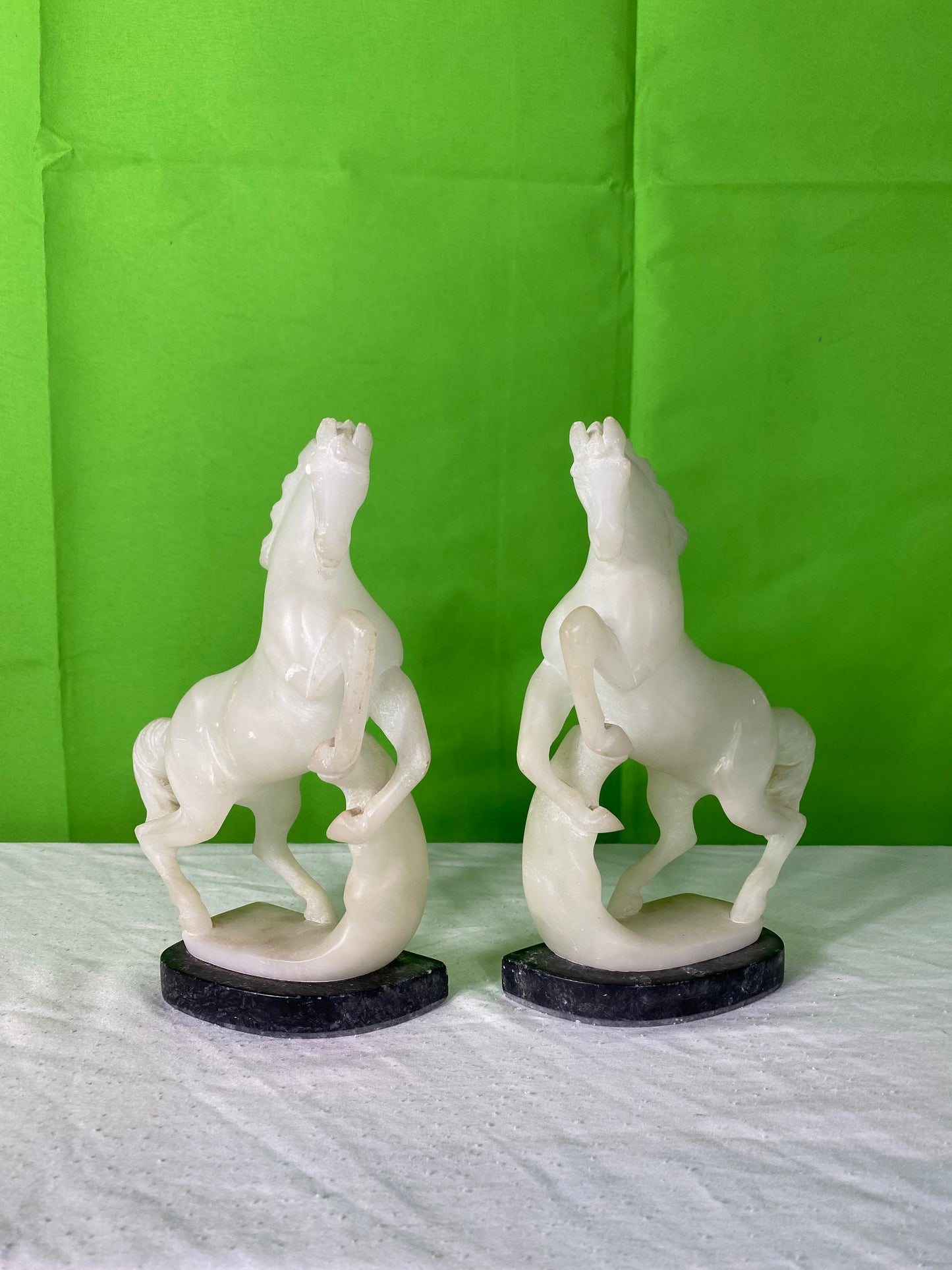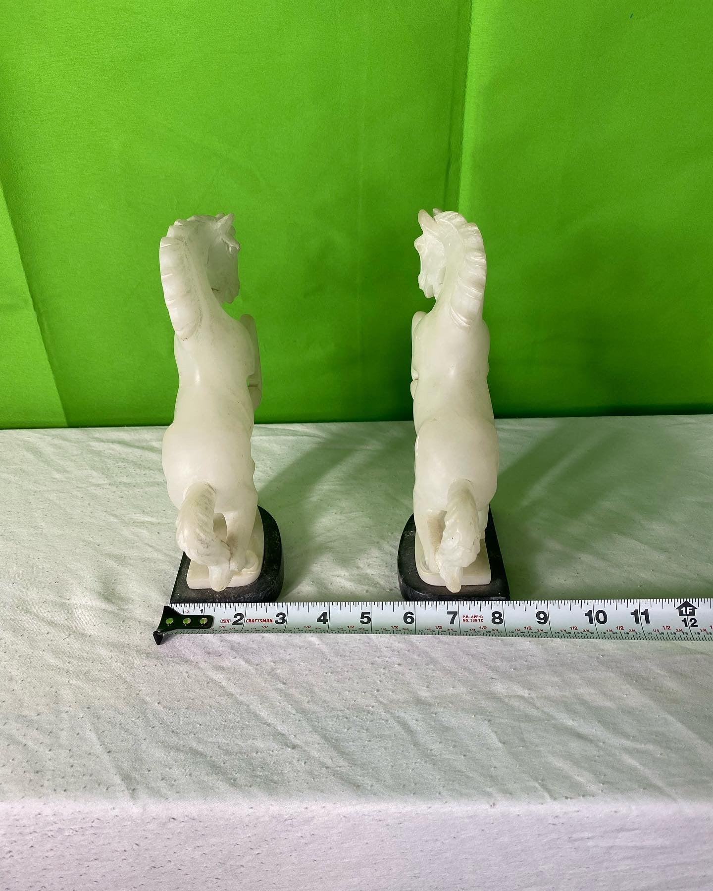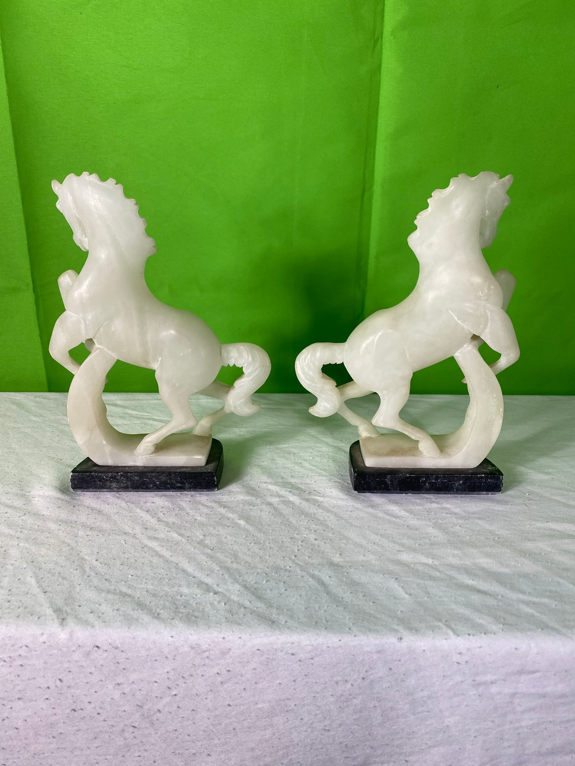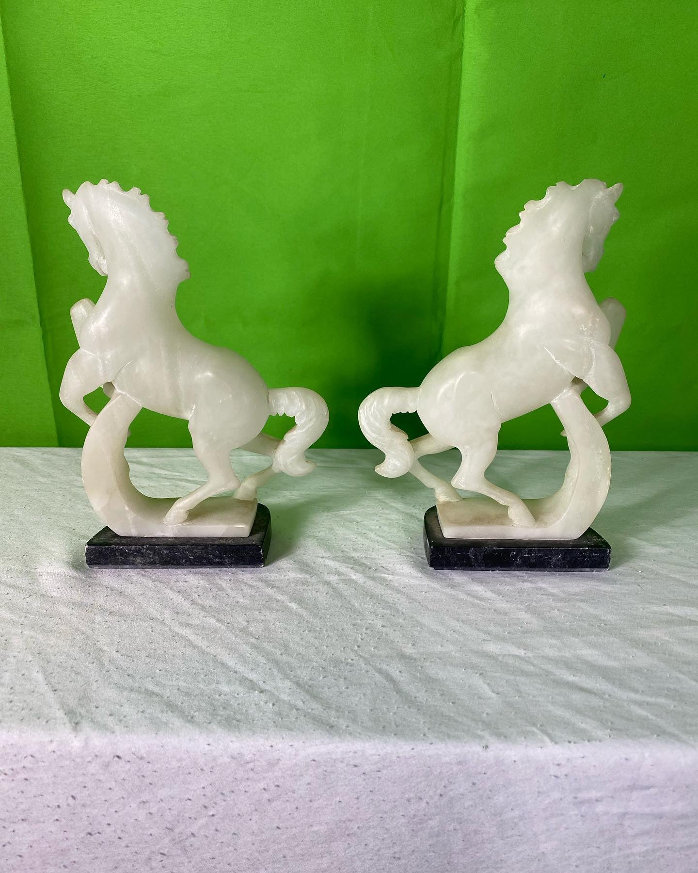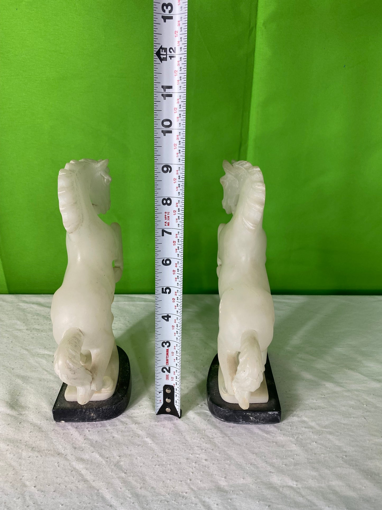 Pair Vintage Hand Carved Alabaster Stone Horse Bookends on Marble Bases