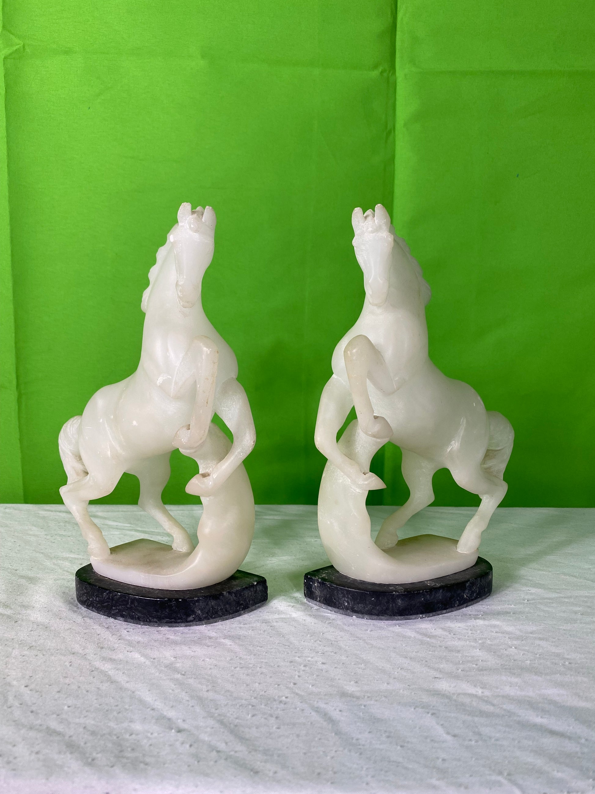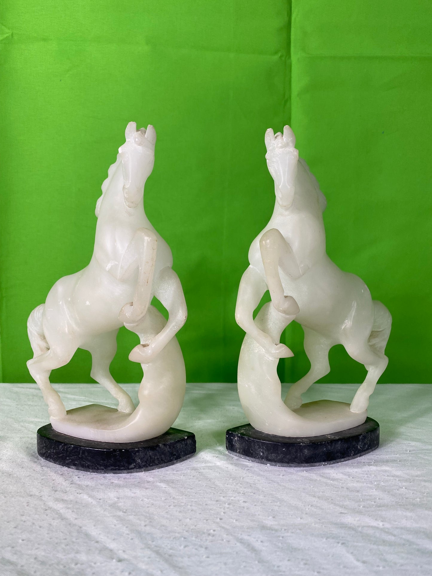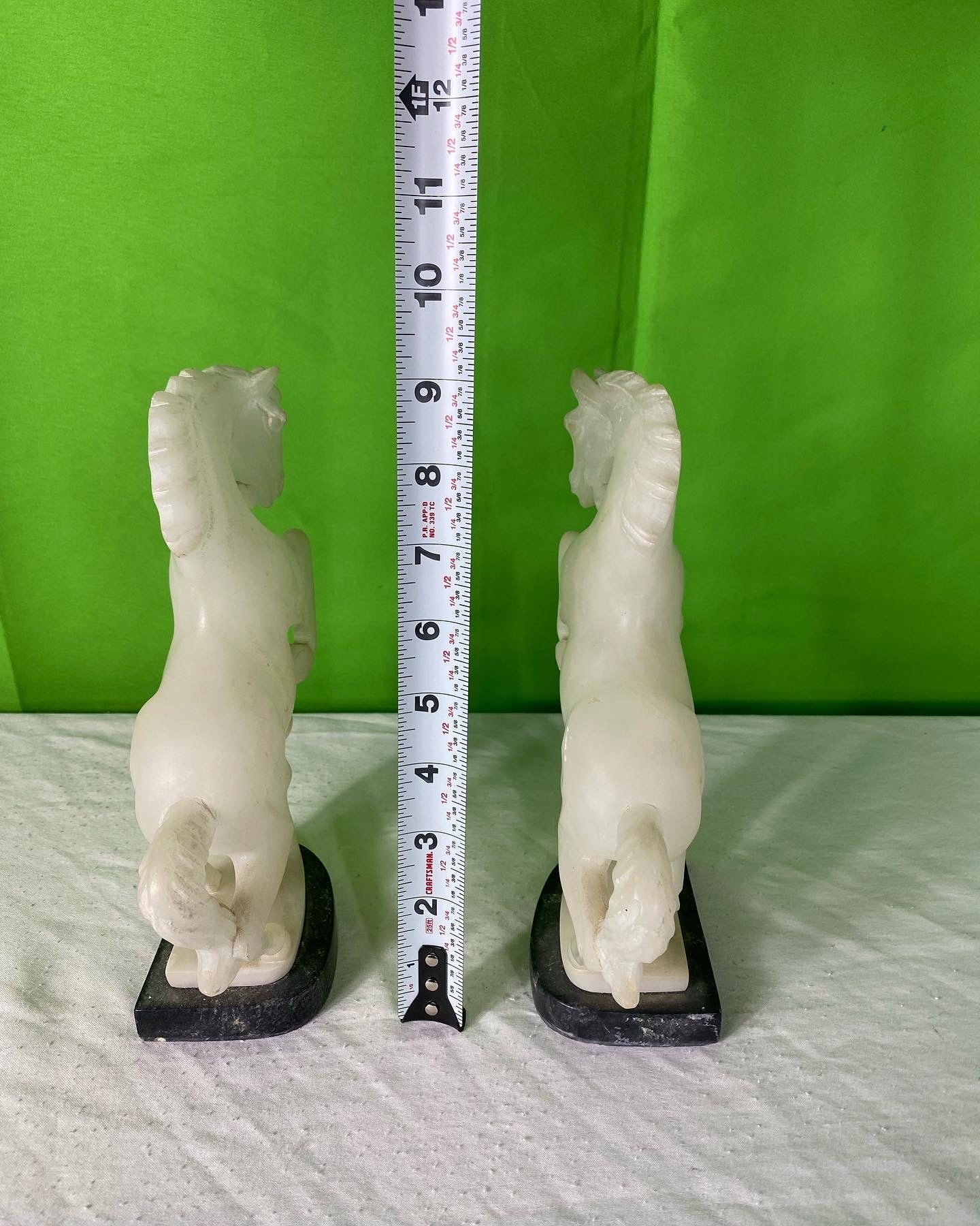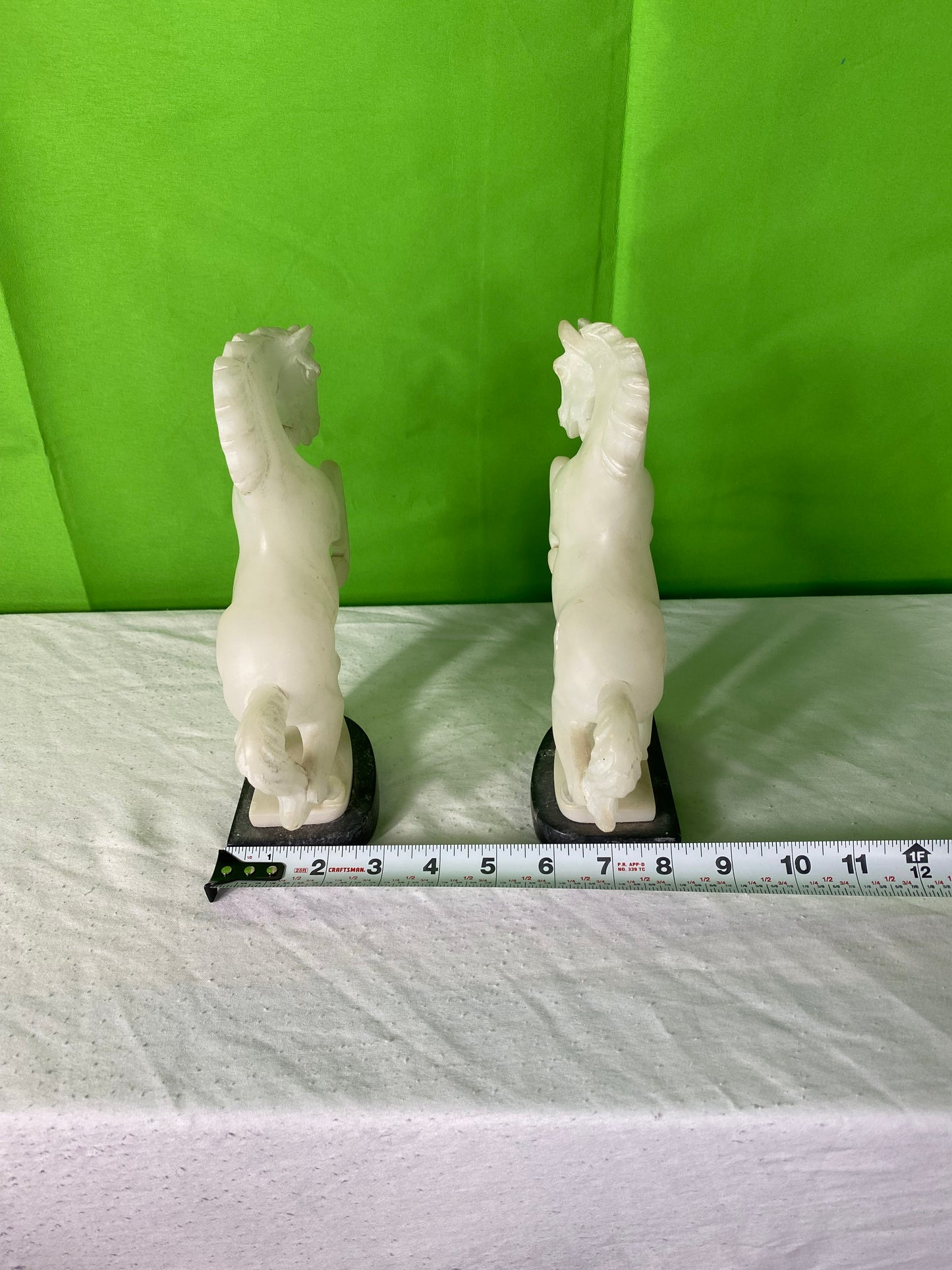 Pair Vintage Hand Carved Alabaster Stone Horse Bookends on Marble Bases