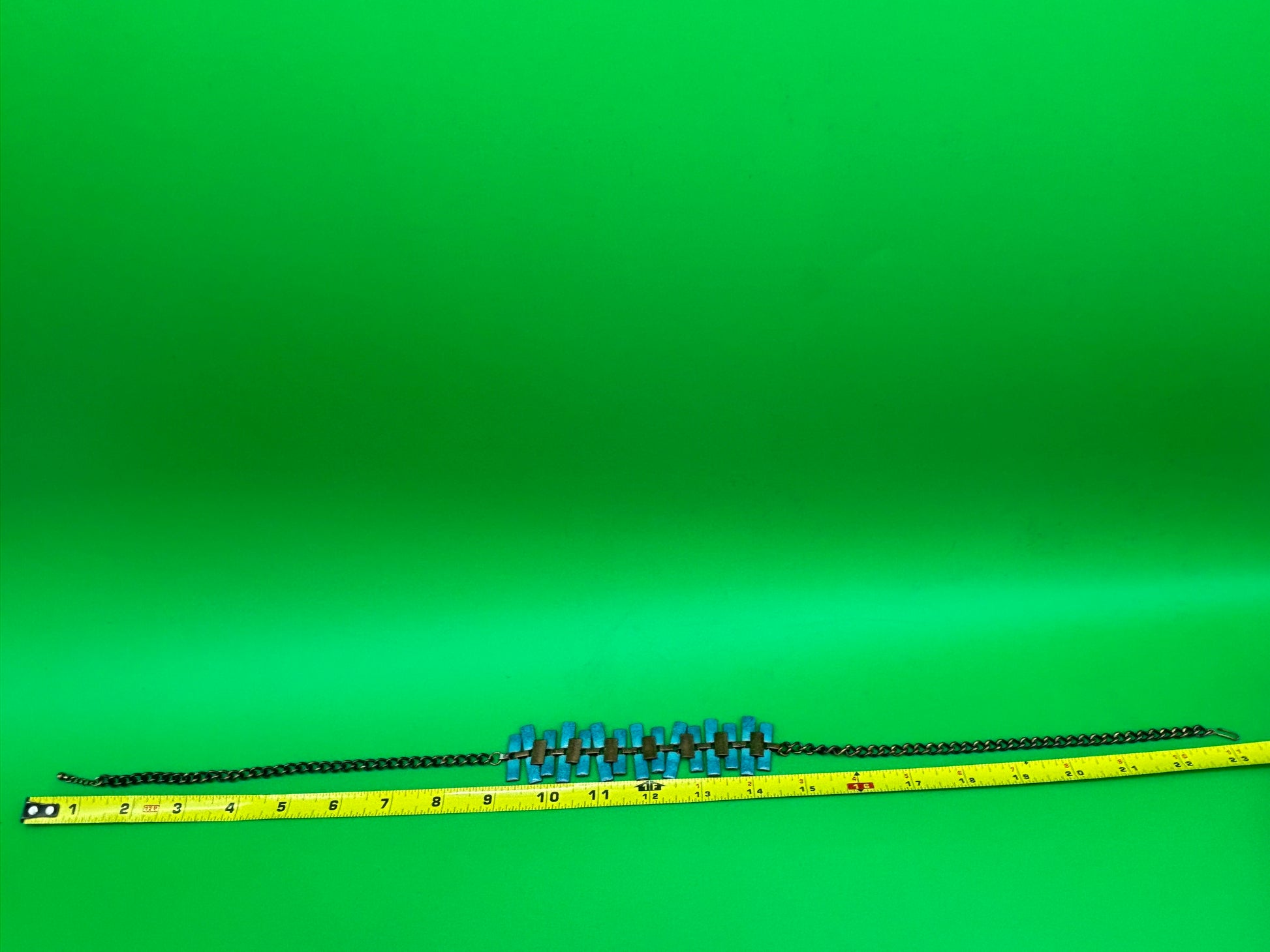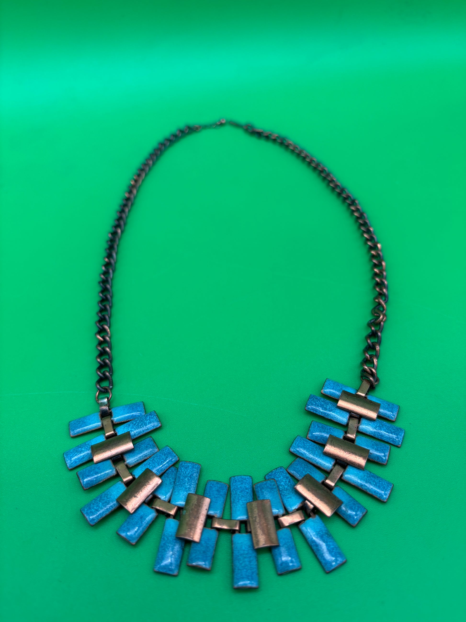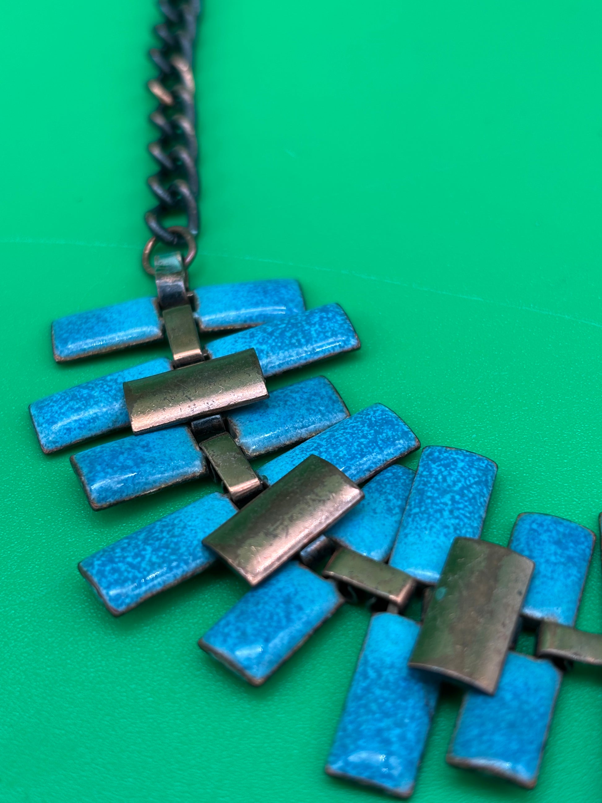 Stunning vintage estate Mid Century Modern enameled copper statement necklace in a bold geometric modernist design. This eye-catching piece features vivid bright blue rectangular panels paired with rich warm copper-tone links for an unmistakable MCM look.