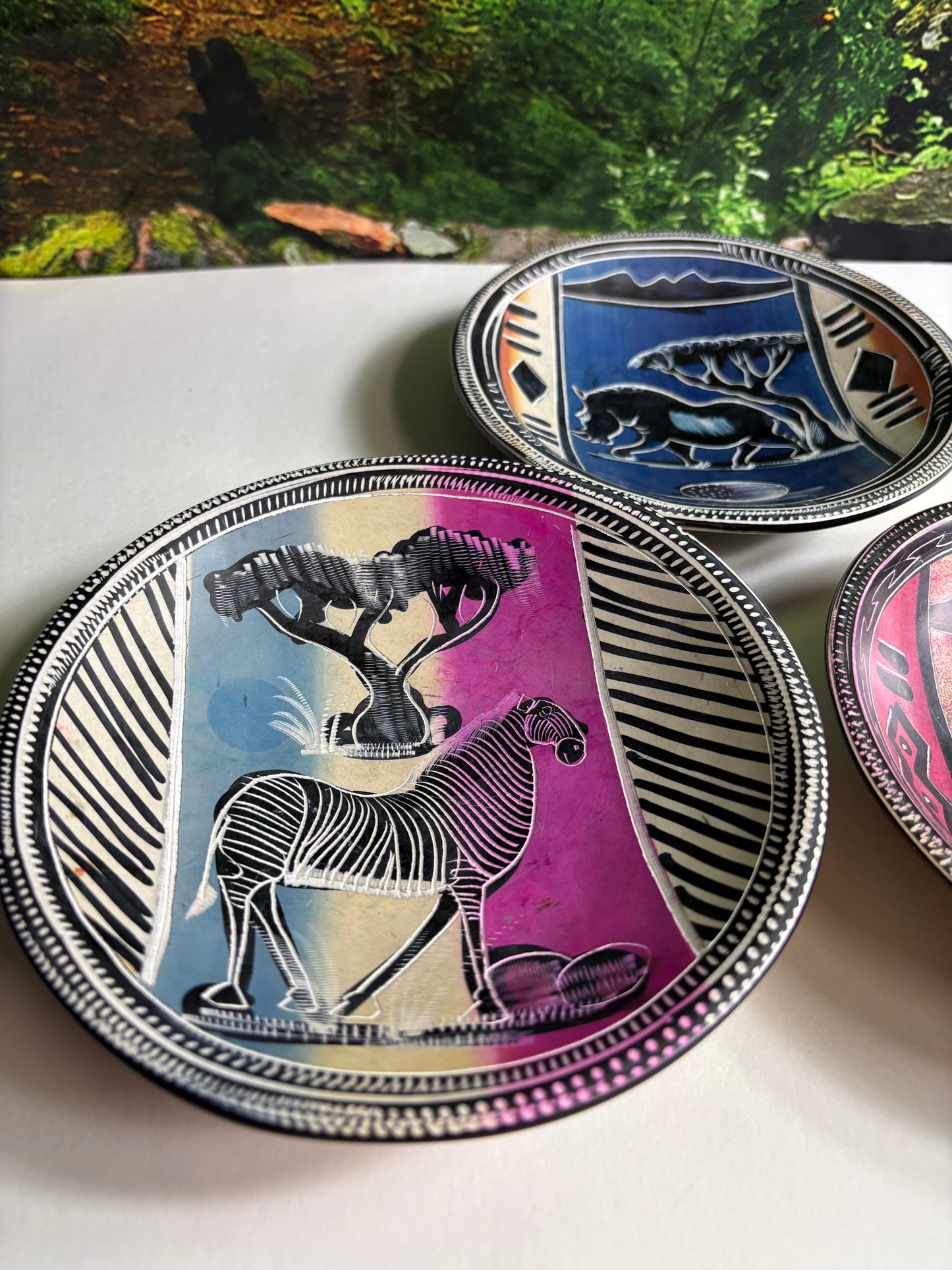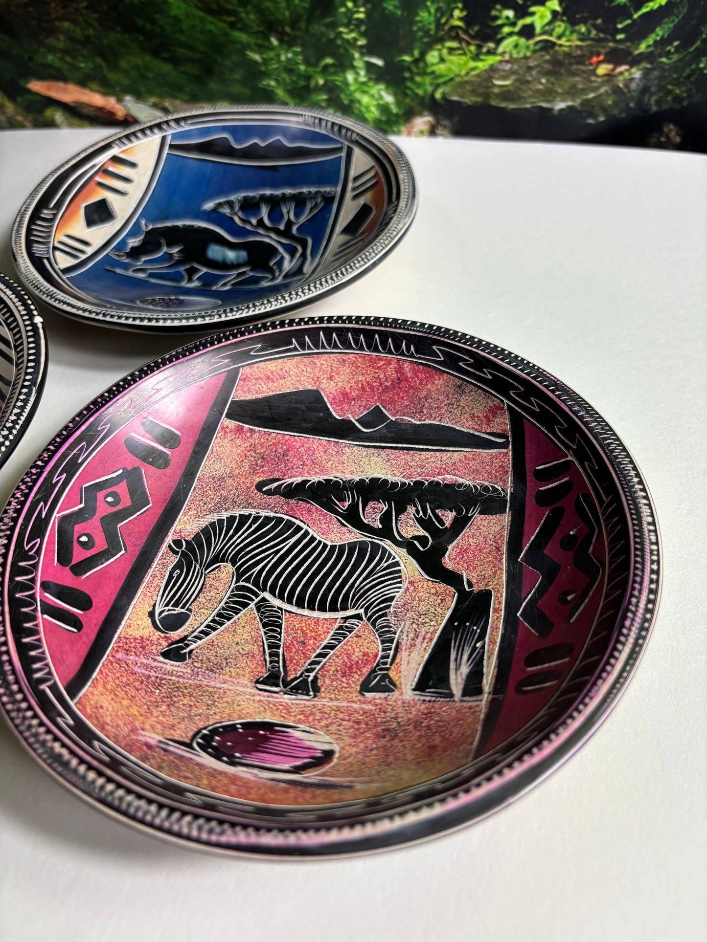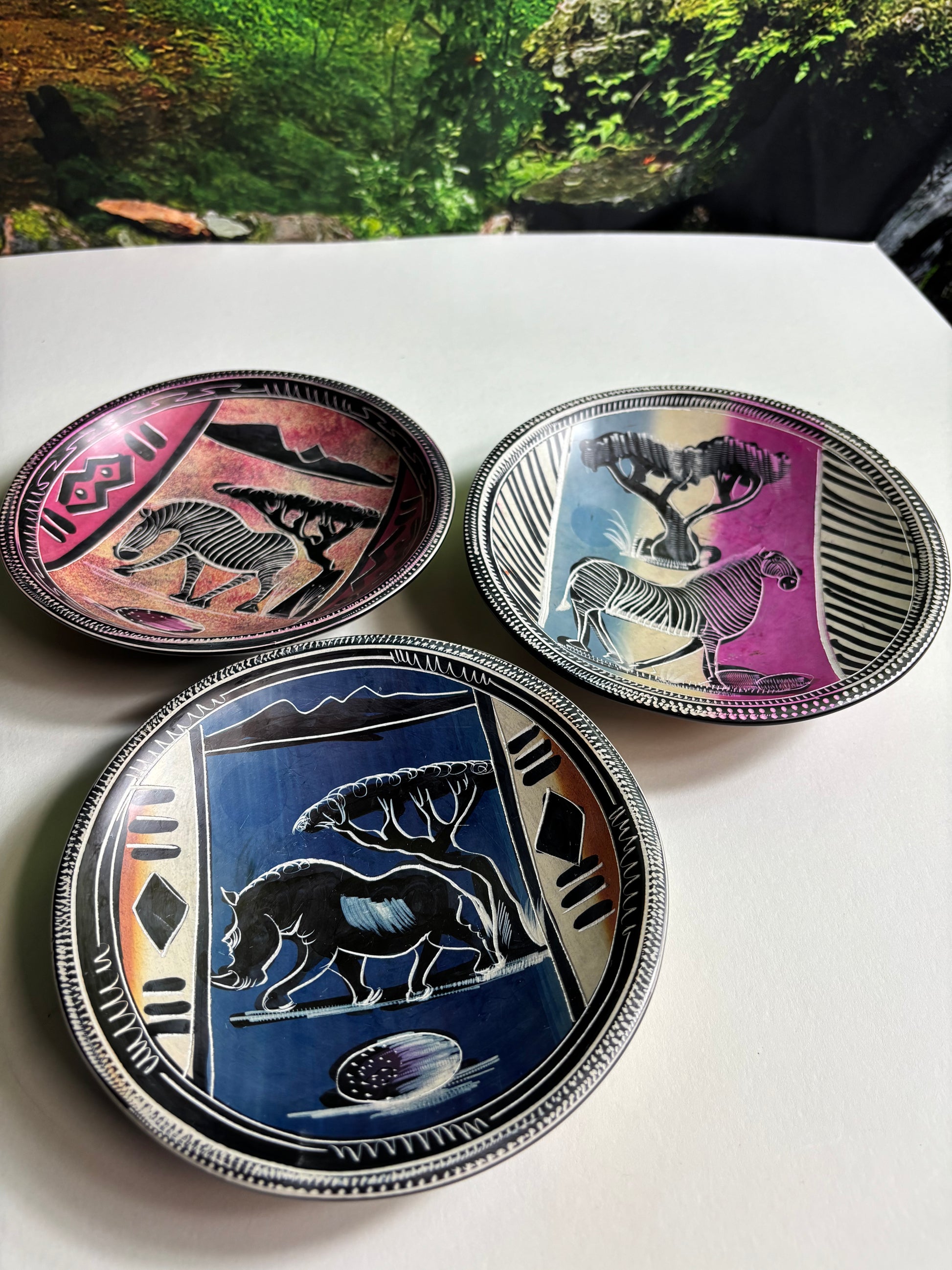 Add global elegance to your home with this set of three 6” African Safari soapstone trinket bowls—each hand-carved and painted with unique safari motifs, blending natural artistry, functionality, and authentic craftsmanship.