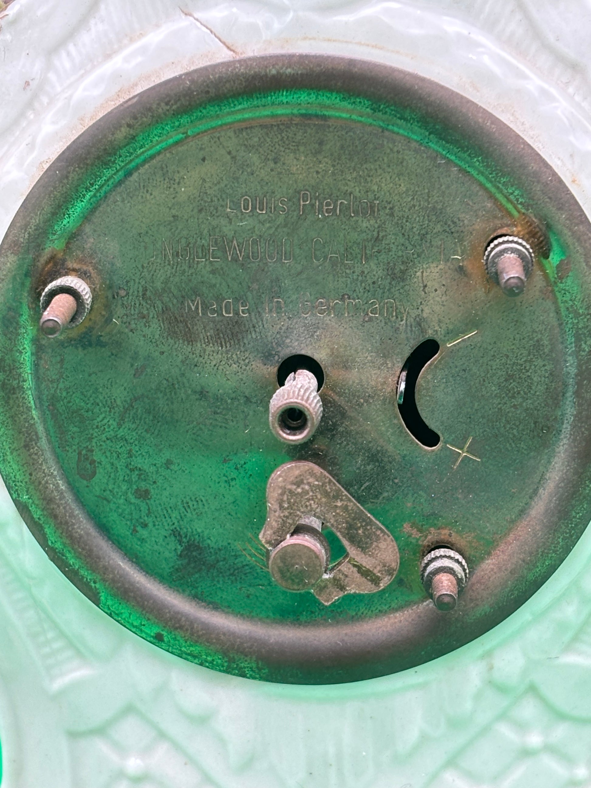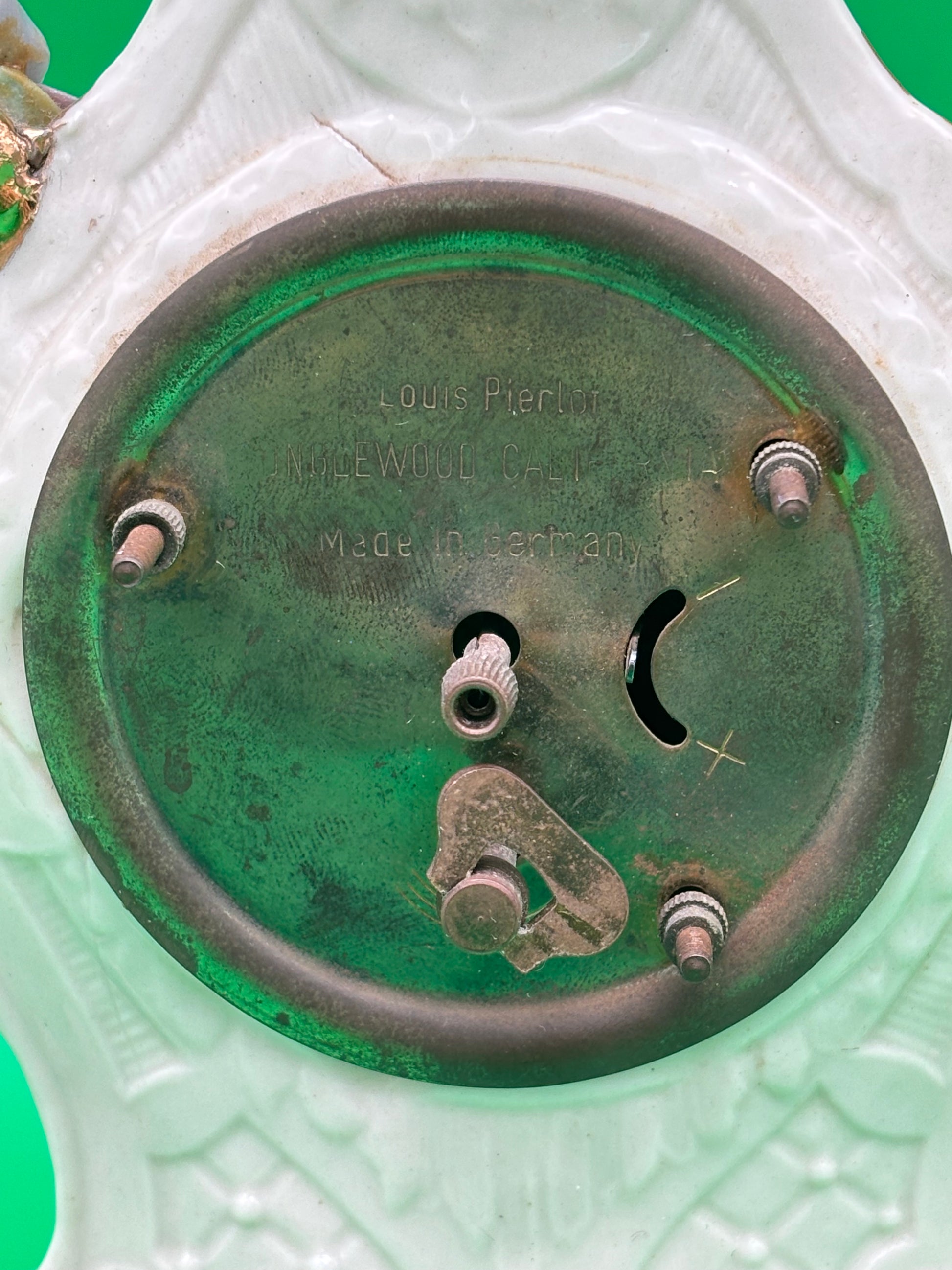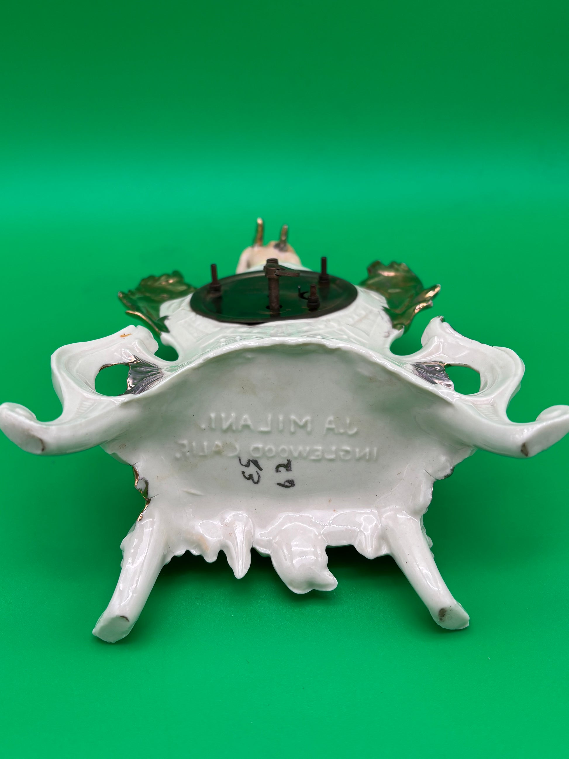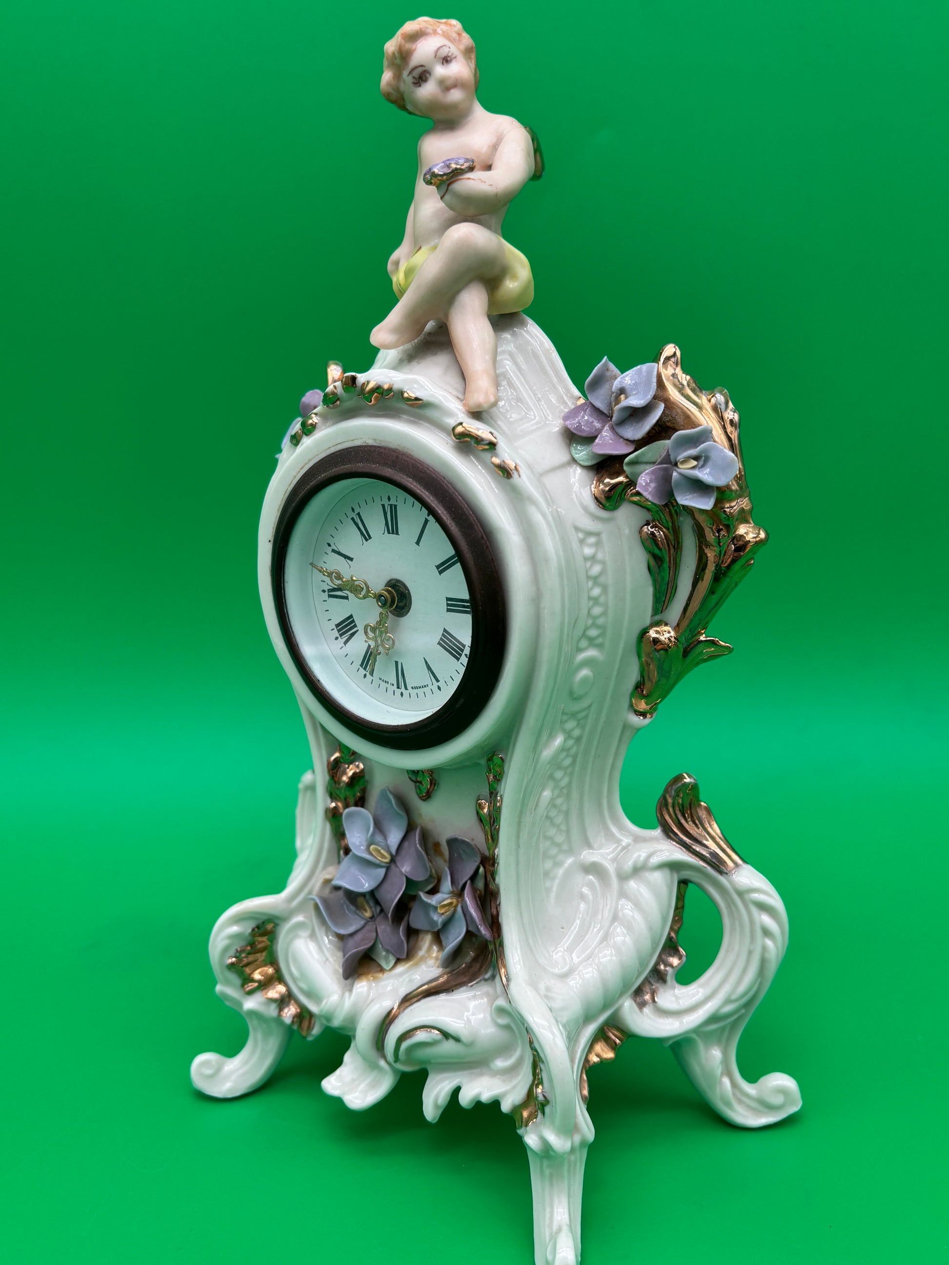 Beautiful vintage Louis Pierlot porcelain mantel clock, marked “Louis Pierlot – Inglewood, Calif. – Made in Germany.” This elegant 10-inch decorative clock features a seated cherub figure, ornate Rococo-style scrollwork, hand-painted floral appliqués, and gold accents.