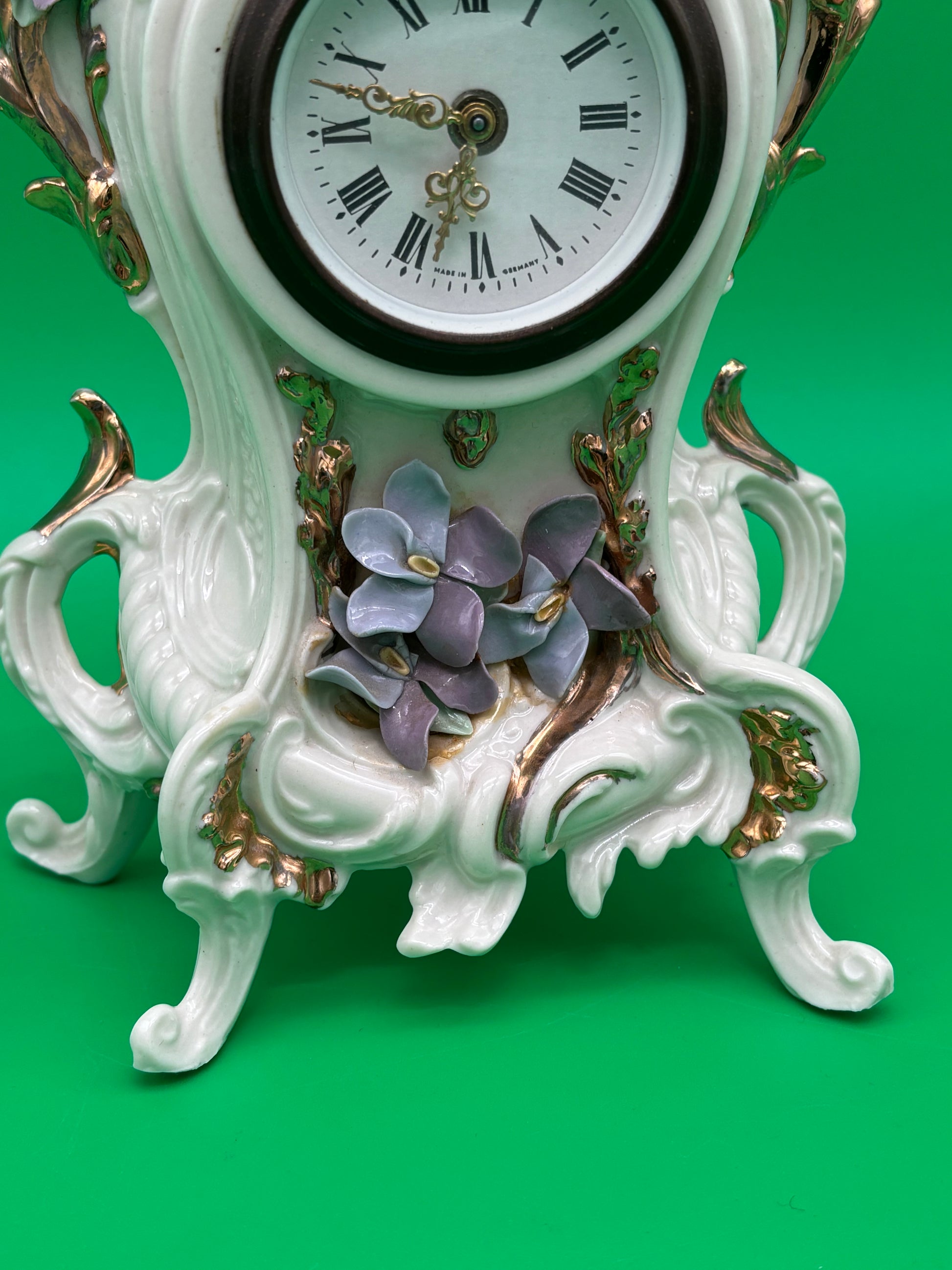 Pre-owned vintage condition. Porcelain is glossy and displays beautifully. Please review photos carefully for any light age wear, minor crazing, or small imperfections typical of vintage porcelain clocks. Movement condition not guaranteed