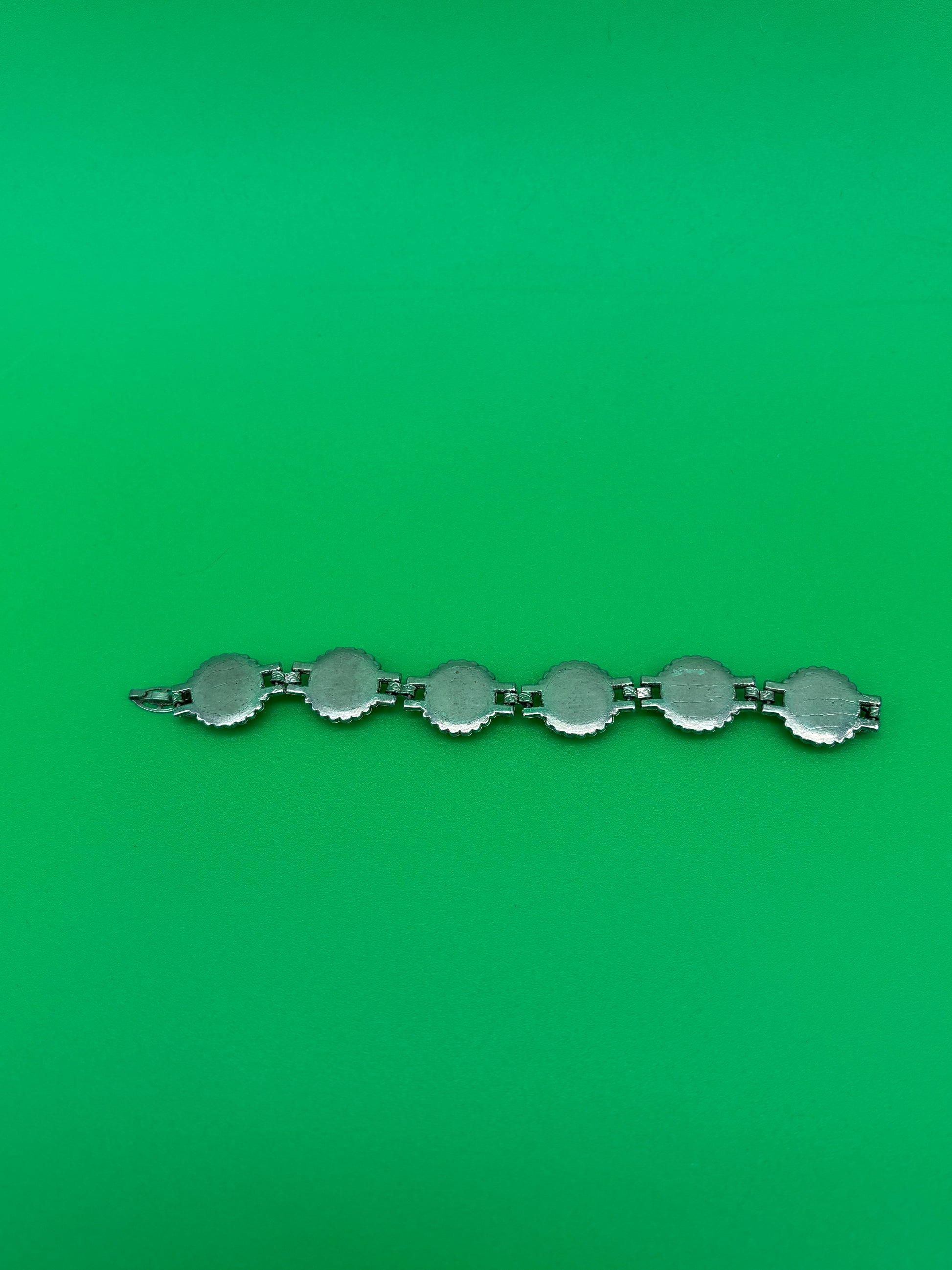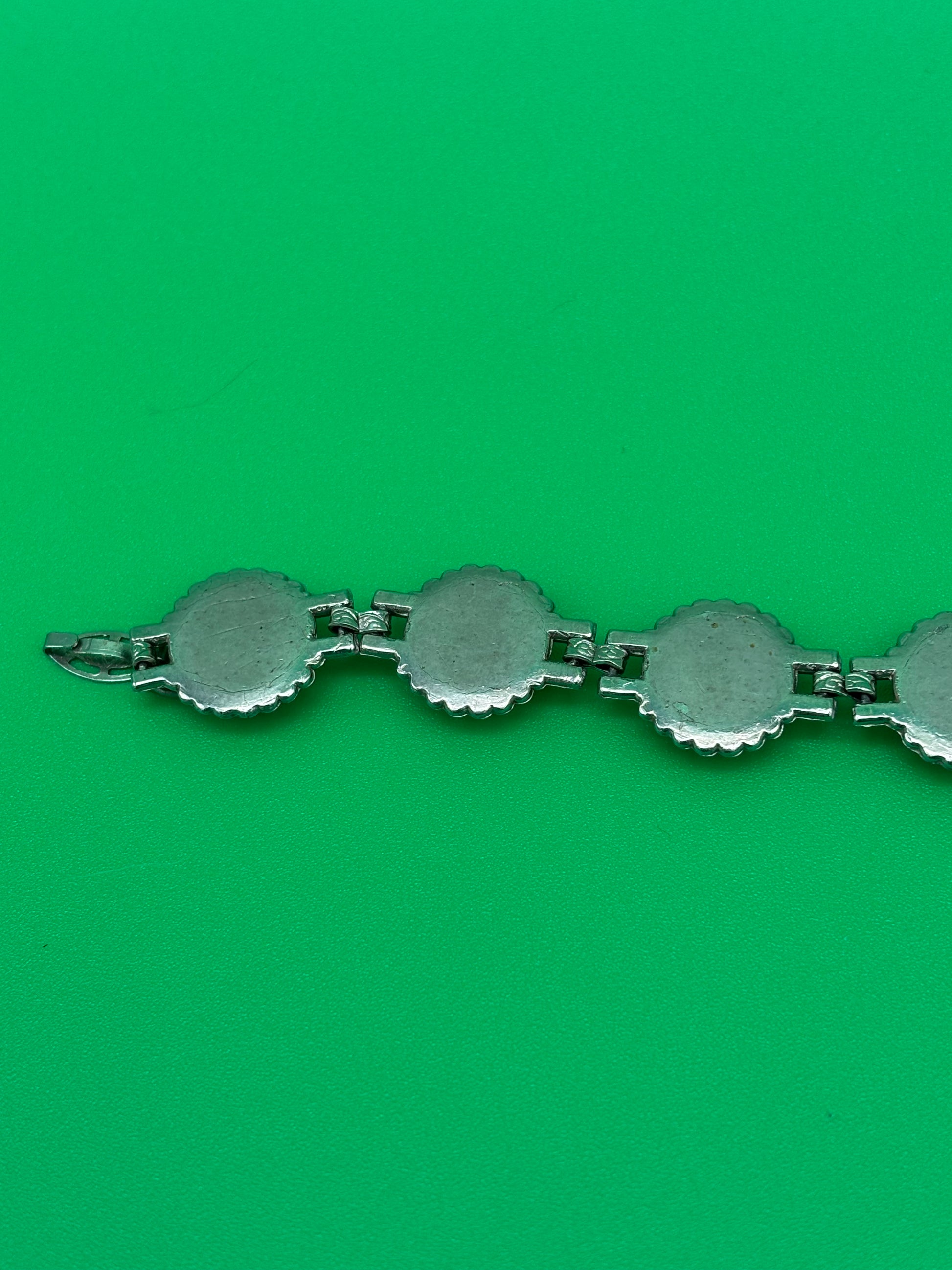 This stunning vintage estate bracelet features a high-end mid-century modern design with a beautiful turquoise tone. Measuring 7 inches in length, this bracelet exudes elegance and sophistication, making it a perfect accessory for any special occasion or outfit. Its unique and eye-catching style will surely make a statement and elevate any look with its vintage charm and timeless beauty.