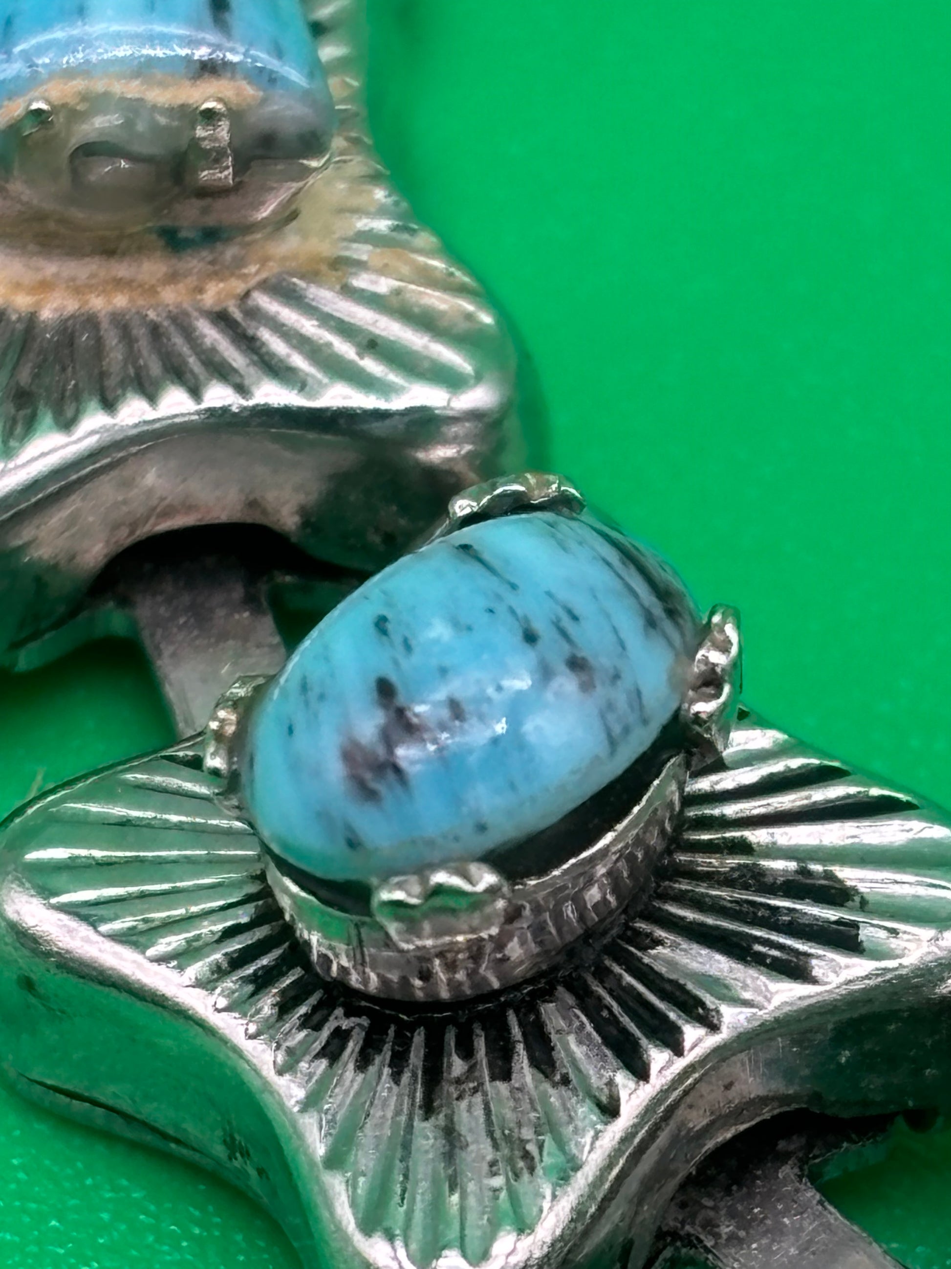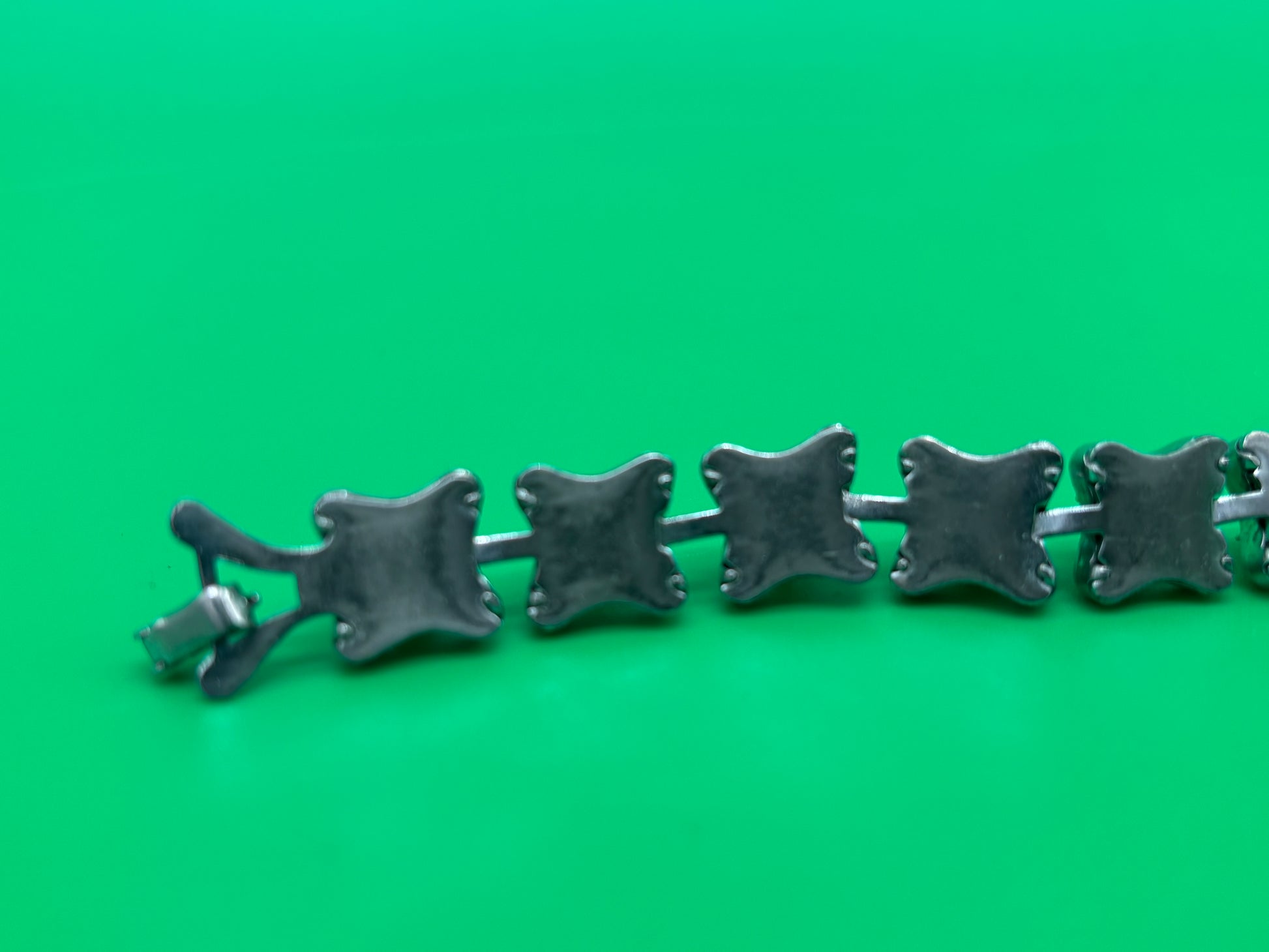 This stunning vintage bracelet features a high-end mid-century modern design with a beautiful turquoise tone. Measuring 7 inches in length, this bracelet exudes elegance and sophistication, making it a perfect accessory for any special occasion or outfit. Its unique and eye-catching style will surely make a statement and elevate any look with its vintage charm and timeless beauty.