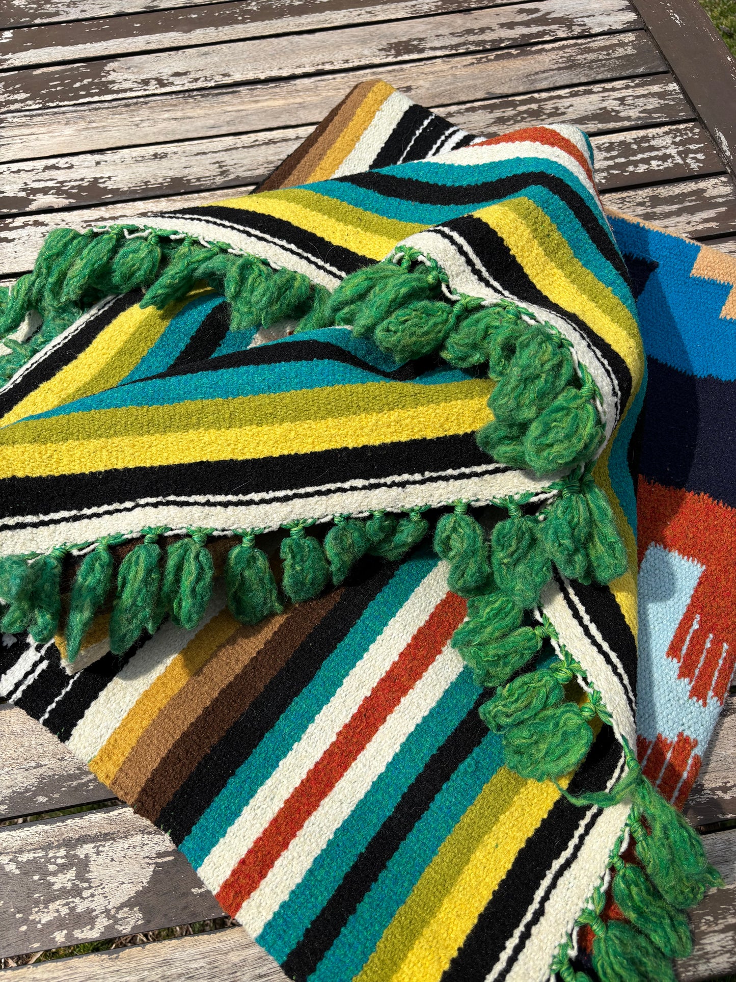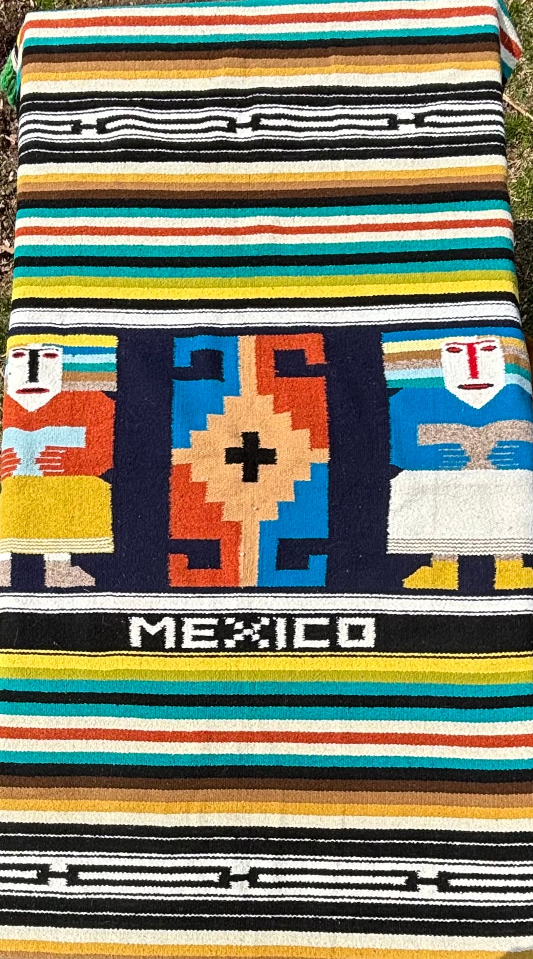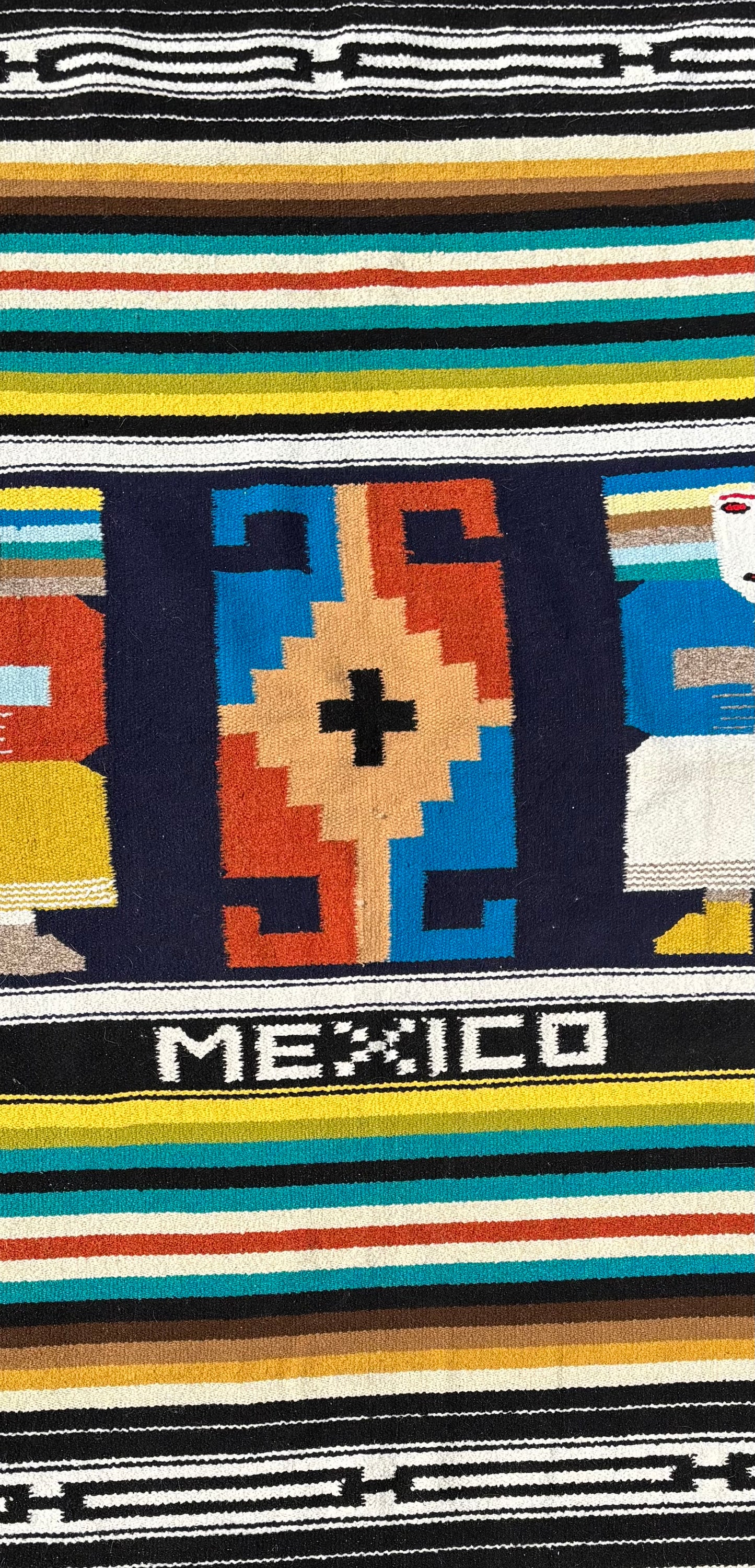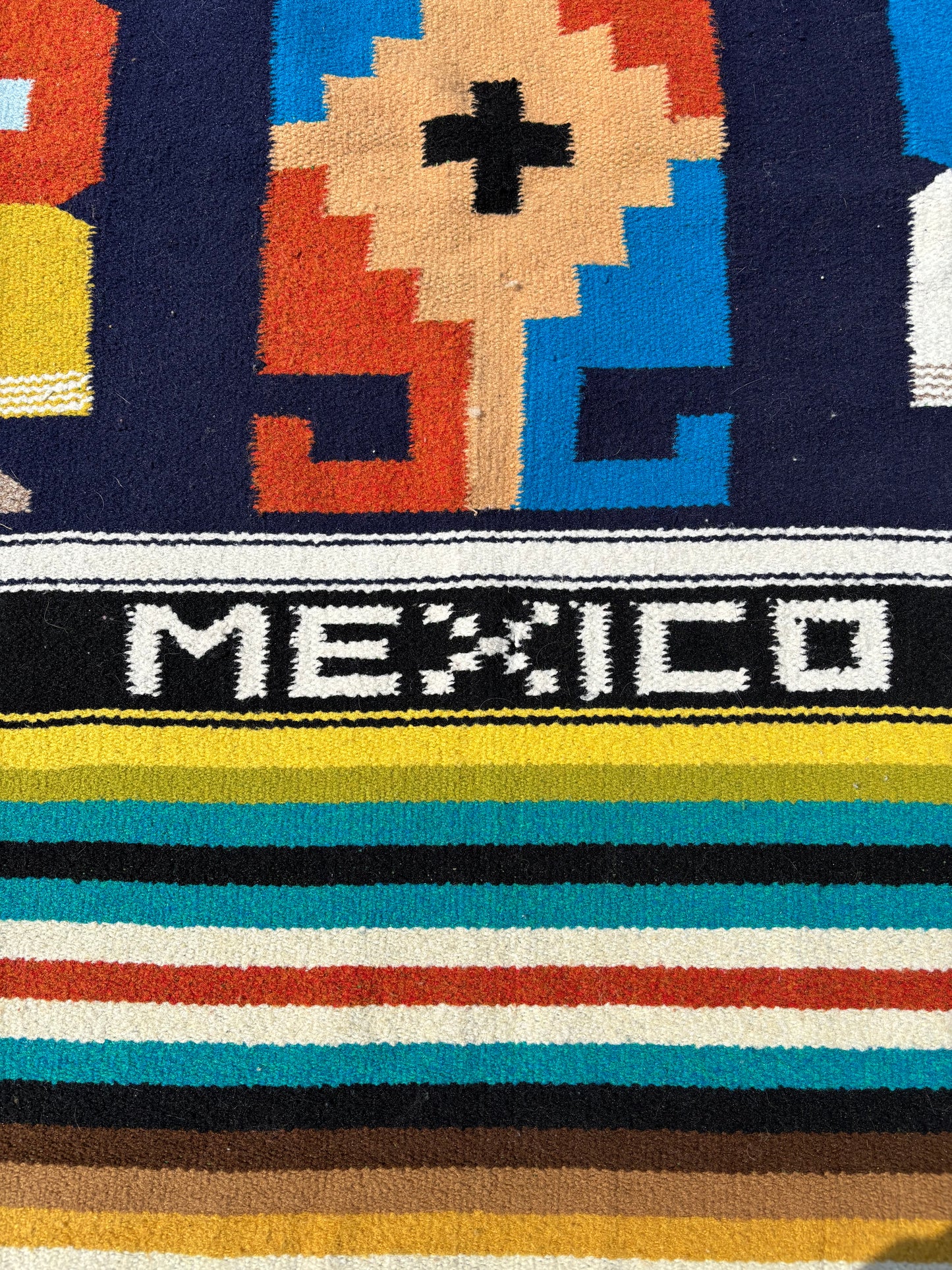 Infuse your home with vibrant heritage through this vintage Mexican rug—an authentic Aztec design woven in rich, earthy tones that tell a story of ancient artistry and bold cultural spirit.
